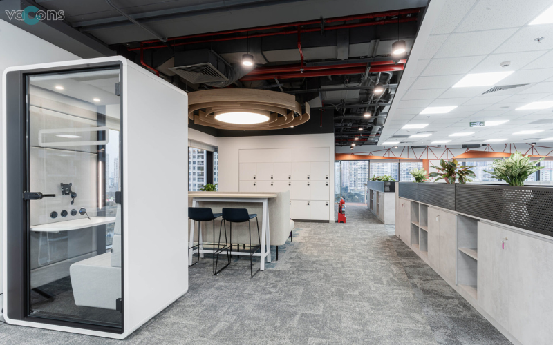 Đặt booth gần phòng họp hoặc khu vực chung giúp nhân viên dễ tiếp cận. Đồng thời, vị trí hợp lý hỗ trợ quản lý không gian văn phòng, đảm bảo booth không chiếm diện tích quá lớn, vẫn đảm bảo tính thẩm mỹ và tiện ích.